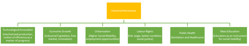 The Industrial Revolution spurred technological innovation, economic growth, urbanization, labour rights, public health improvements, expanded education, political reforms, scientific problem-solving, and early environmental awareness, all fostering the belief in continuous societal progress.